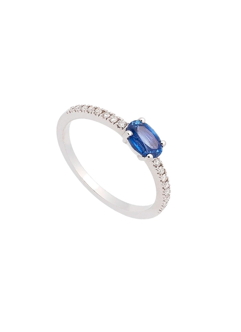 Anillo de oro blanco con zafiro oval y diamantes en brazo