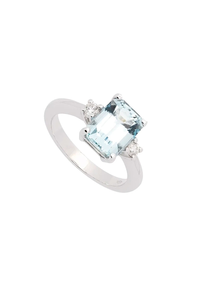 0Anillo de oro blanco de 18Kt, con una aguamarina talla rectangular con galerías de 2,32ct y un diamante talla brillante a cada lado, con un peso total de 0,12ct y calidad G VS2.