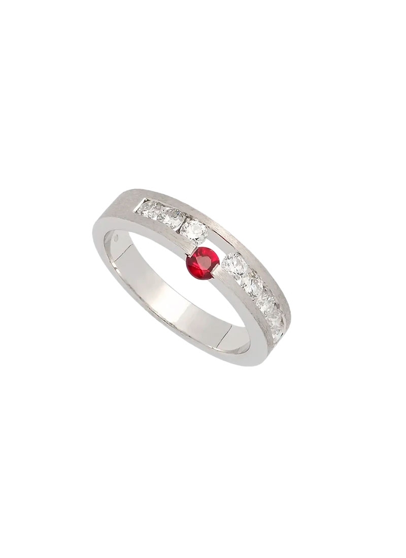 Anillo de oro blanco con diamantes y zafiro rojo