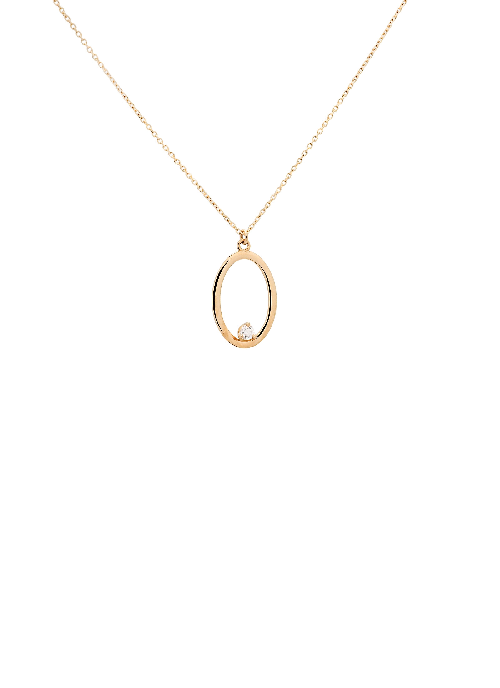 Fina cadena de oro amarillo de 18Kt de 42cm de largo, con asa extra, permitiendo una medida de 40cm. Lleva un pequeño colgante en forma de óvalo de 15x10mm con un pequeño diamante talla brillante (0,03ct) engastado en garras.