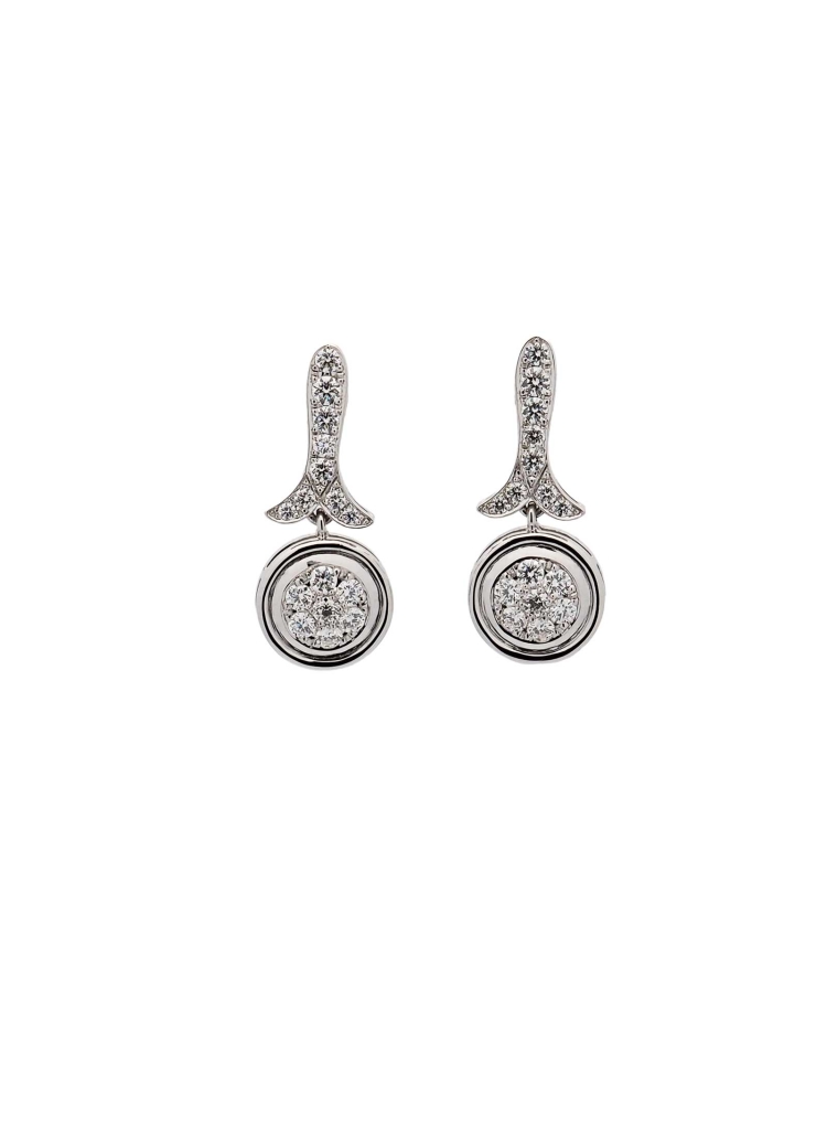 Pendientes de oro blanco de 18Kt, hechos a mano. Compuestos por un motivo superior en forma de flor de lis del que pende un motivo circular. Ambos con un total de 32 diamantes talla brillante con un peso total de 0,85ct de calidad D-F/VS1.