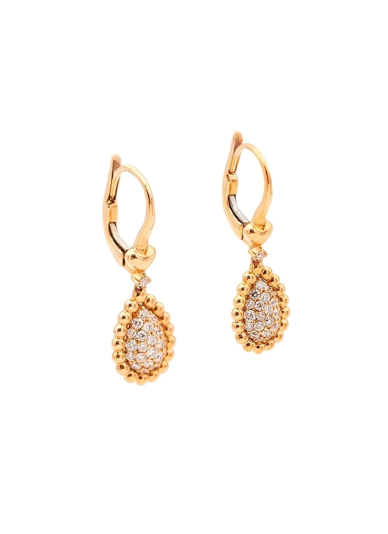 Pendientes largos de oro rosa de 18Kt con un pequeño corazón del que cuelga un diamante talla brillante y un motivo en forma de gota en pavé de diamantes talla brillante con orla de esferas.
